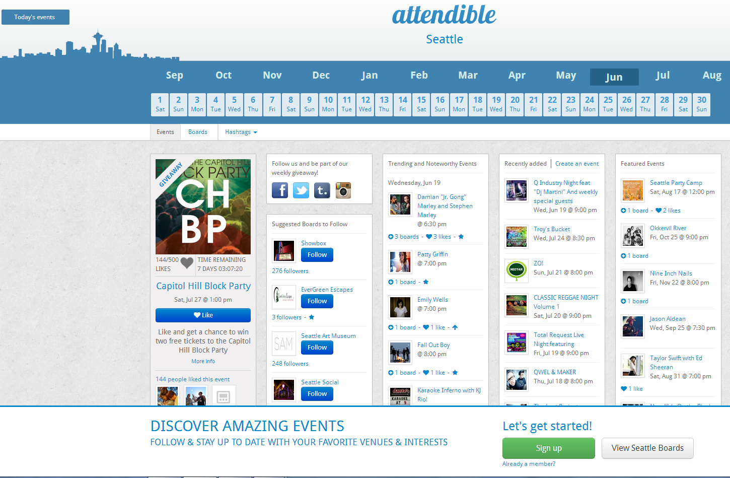 The value proposition is made really clear by the two lines of text at the bottom of the page.  “Discover amazing events.” “Follow and stay up to date with your favorite venues & interests.”  It tells me what problem it solves and calls out the key features.  But why is that text at the bottom of the page!?  I like the Seattle skyline graphic (hey you know my city, and you have put some effort into my city), but that calendar graphic, yikes!  I it is not the way we are used to seeing calendars and the month doesn’t tie well visually to the dates. Why does it start with Sept, and why is June (the current month) way off to the right.  Is it Sept 2012 or 2013?  I like that I can actually see the product interface on the home page, but I would pump up the headers of the columns.  So I get the value proposition.  The call to action “Let’s get started”, makes it sound like I have a bunch of work ahead.  How about something like, “Find great events” or “Personalize your event boards”.  There are no trust builders, but I assume it is free, and I am getting value just from the homepage, so I don’t need someone’s testimonial to tell me that it helps them find events.